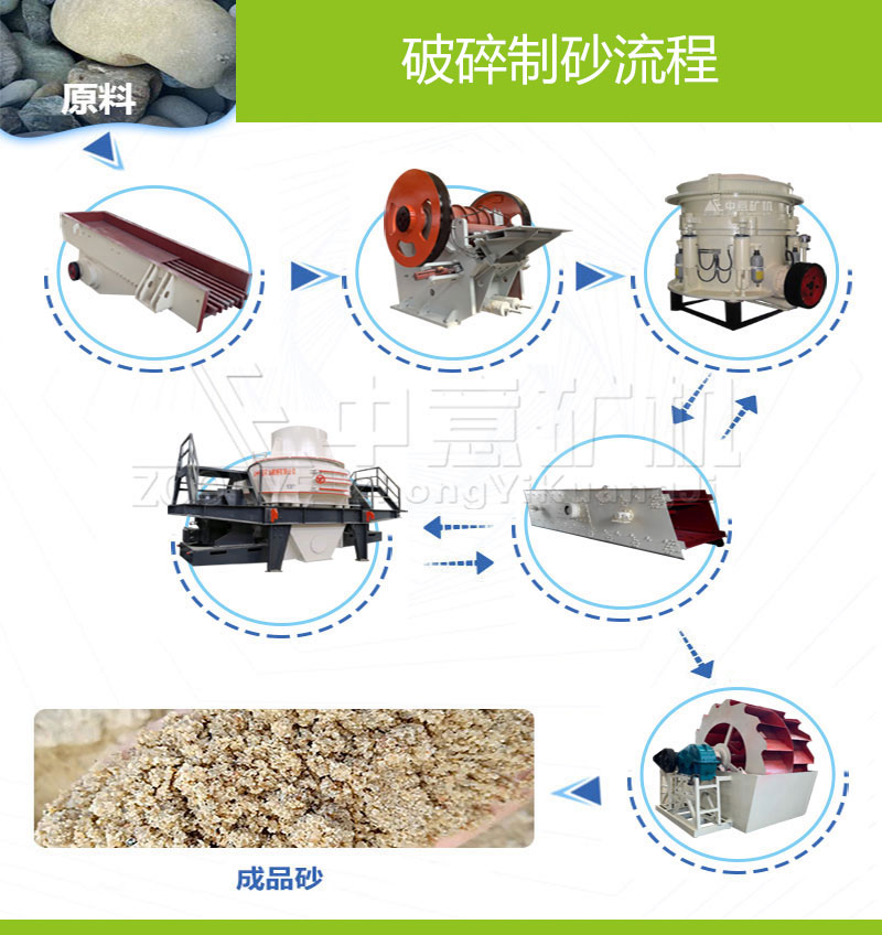 制砂生產(chǎn)線由給料機(jī)、粗破(顎式破碎機(jī))、制砂機(jī)(細(xì)碎機(jī))、洗砂機(jī)、篩分設(shè)備和膠帶傳輸機(jī)等設(shè)備組合而成。根據(jù)不同的工藝要求,各種型號的設(shè)備進(jìn)行組合,可以生產(chǎn)出不同粒度的砂石。制砂生產(chǎn)線設(shè)備可用于硬質(zhì)石灰石、花崗石、玄武巖、河卵石、冶多渣等多種物料的骨料及人工造砂作業(yè),適用于水電、建材、高速公路、城市建設(shè)等行業(yè)的應(yīng)用。